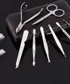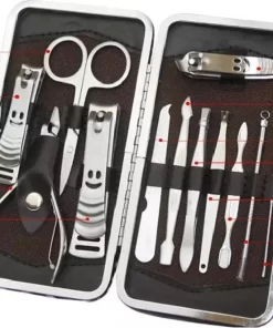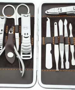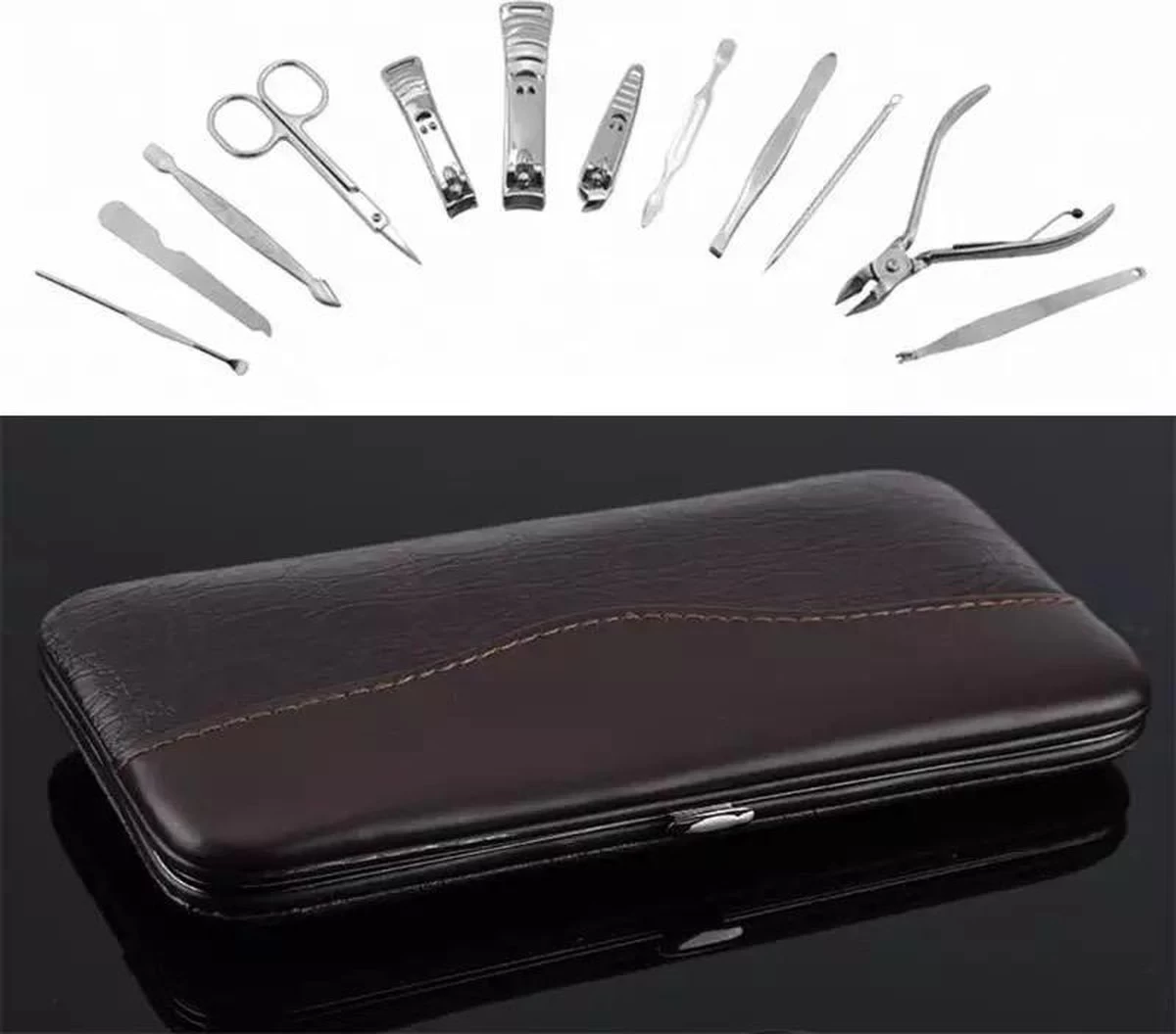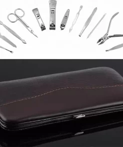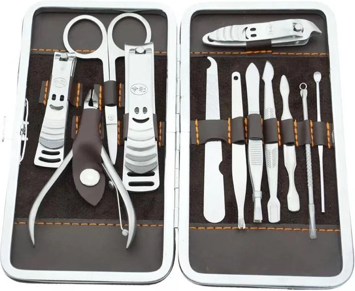 Luxe 12-delige manicure- en pedicureset in een prachtige zachtlederen opbergetui. De accessoires zijn vervaardigd uit roestvrij staal, voelen zeer degelijk aan en zijn ideaal voor iedereen die thuis of op vakantie een manicure of pedicure wil toepassen.