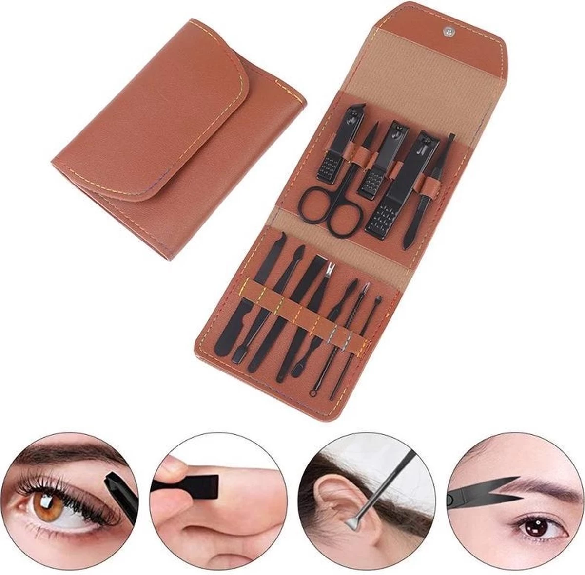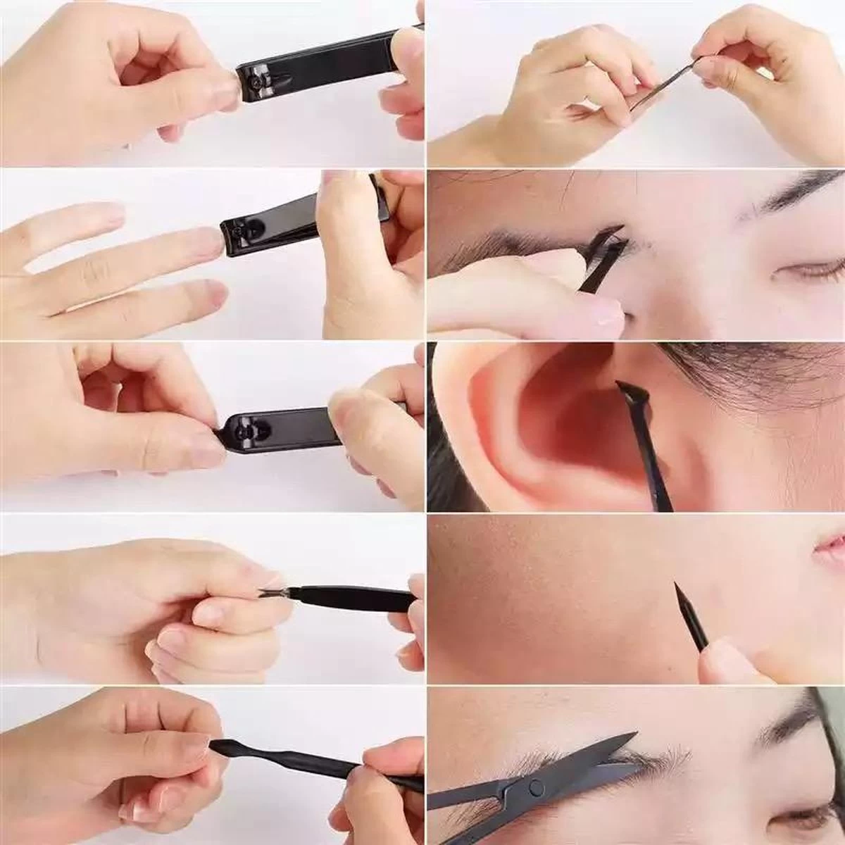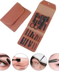 - Handverzorging (kleine nagelknippers, schuine nagelknippers, nagelriemtang, dubbele nagelreiniger, nagelvijl, dode huid vork, snijmes); voetverzorging (grotere nagelknippers, plat pedicure mes, schuine voet pedicure mes); gezichtsverzorging (wenkbrauwschaar, wenkbrauwpincet, oorplekken, acne kom naalden, acne naalden); reinigingsborstel