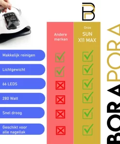 Met de SUN X10 MAX van BoraPora kunt u eenvoudig, snel en zeer efficiënt uw nagels laten drogen. U behaalt een professioneel resultaat zoals u in de salon zou verwachten, maar dan thuis! Ook geschikt voor professioneel gebruik dus! Dit is mogelijk dankzij de 66 LEDS van de 280 Watt UV LED lamp. Ook is de opening zowel geschikt voor uw hele hand (inclusief duim) als uw voet!