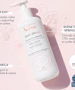 Avène Xeracalm AD Relipiderende Reinigende Olie is geschikt voor de droge- en eczeemgevoelige huid van baby’s, kinderen en volwassenen. De doucheolie verzacht de jeuk dankzij de ingrediënten Omega 6 en ceramiden. Het helpt een rode huid te vervagen en de hypergevoelige huid te verzachten en te herstellen. Het product is zeep- en parfumvrij, waardoor het niet prikt als het in aanraking komt met de ogen.