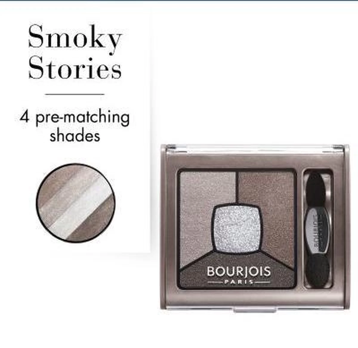 Bourjois brengt je Smoky Stories, een oogschaduw palette met vier complementaire tinten die moeiteloos mengen om een intense smokey eye te creëren. De lichtste tint maakt je ooglid klaar voor een resultaat dat tot wel 12 uur blijft zitten. De middelste schaduw voegt contour toe, terwijl de donkerste kleur schaduw geeft aan de ooglook. Breng de glitter aan onder je wenkbrauwen en in de hoeken van je ogen om de look helemaal af te maken. Wanneer je een handig palet wilt voor een perfecte smokey eye, biedt Smoky Stories van Bourjois het ideale kwartet van mengbare crèmekleurige poeders plus een applicator met dubbele uiteinden voor een geavanceerd maar subtiel resultaat. Voeg één van de Smoky Stories-paletten toe aan je make-up routine om een eindeloze reeks smokey eye looks te creëren, van klassiek tot dramatisch.
