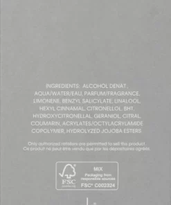 | Ingrediënten | ALCOHOL DENAT., AQUA/WATER/EAU, PARFUM/FRAGRANCE, LIMONENE, BENZYL SALICYLATE, LINALOOL, HEXYL CINNAMAL, CITRONELLOL, BHT, HYDROXYCITRONELLAL, GERANIOL, CITRAL, COUMARIN, ACRYLATES/OCTYLACRYLAMIDE COPOLYMER, HYDROLYZED JOJOBA ESTERS |
