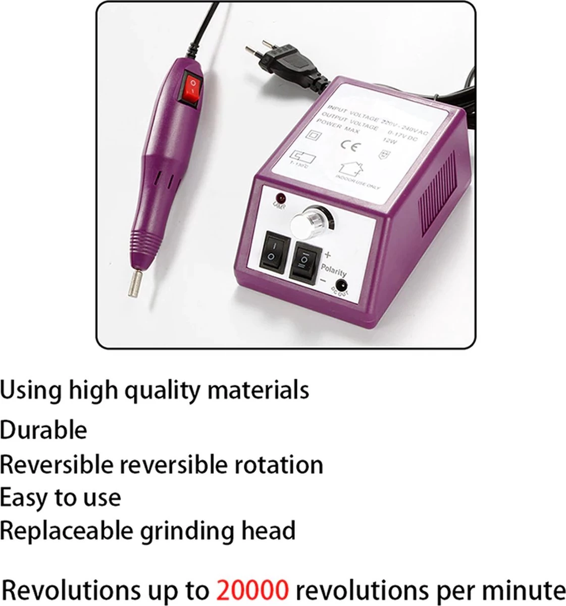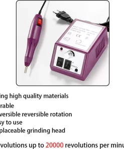 - Instelbare snelheid: de snelheid van de nagelboor kan worden ingesteld van 2.000 tpm tot 20.000 tpm. De vijl kan met de bedieningsschakelaar in verschillende richtingen worden gedraaid.