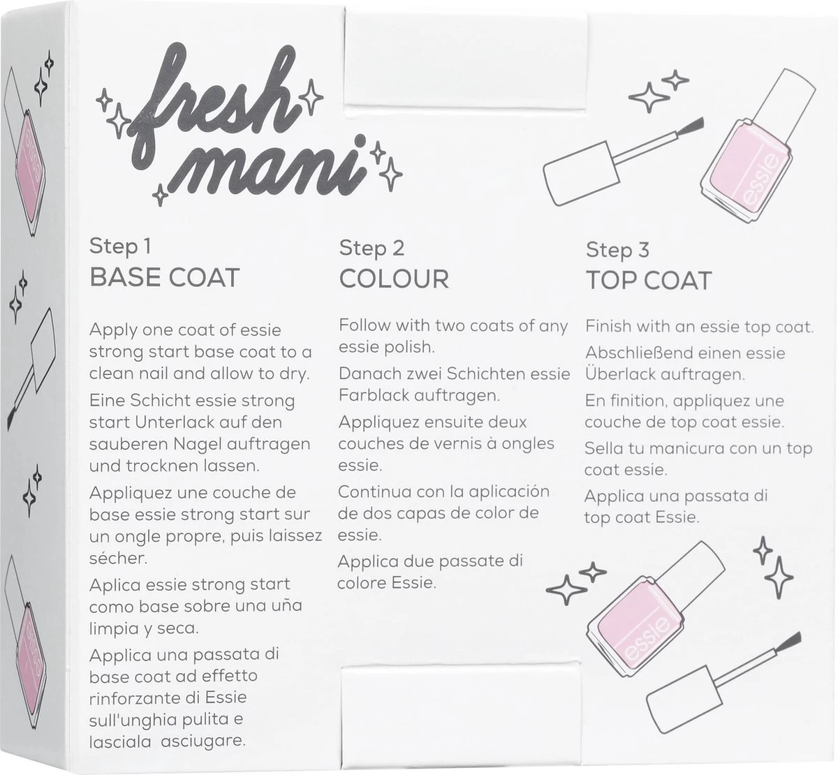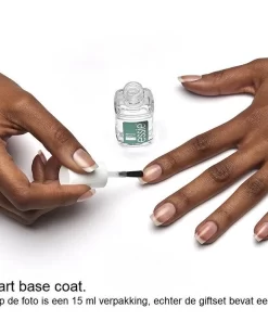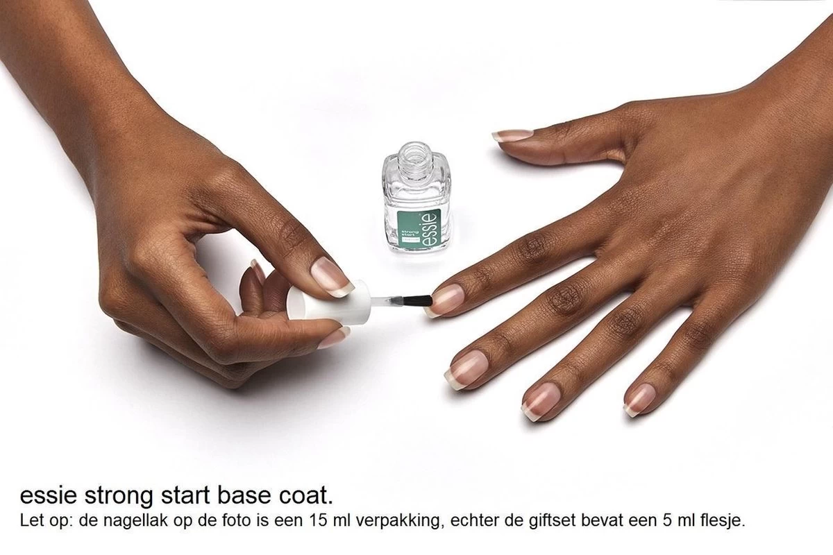 – strong start base coat versterkt en verhard de nagels door de verrijking van biotine in de formule. Ook kan verkleuring van de nagels tegen worden geggaan door een base coat te gebruiken. De essie base coat is extra geschikt voor breekbare en zachte nagels.