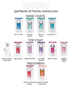 De essie nagelverzorgingscollectie bestaat uit top coats, base coats en nagelverzorging, voor elke stap in de perfecte manicure. Zo wordt de @home manicure verzorgt en beschermt voor een prachtig resultaat.