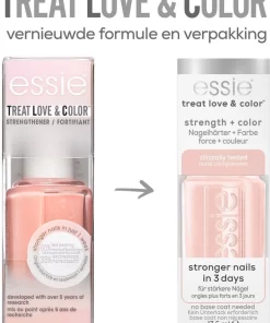 De TREAT LOVE & COLOR™ collectie is essie’s kleur en nagelverzorging in één. De collectie is na een periode van meer dan vijf jaar onderzoek ontwikkeld. TREAT LOVE & COLOR™ combineert het beste van nagelverzorging en -kleur in één product. De collectie gekleurde nagelverharders is vooral geschikt voor kwetsbare, brosse en zwakke nagels. de nagellak van TREAT LOVE & COLOR™ geeft sterkere nagels in drie dagen.** * Zoals verboden volgens EU verordening 1223/2009 **Klinische test: na drie (3) dagen gebruiken: minder droge/breekbare nagels, verbeterde nagelsterkte en verbeterde algehele gezonde uitstraling van de nagels