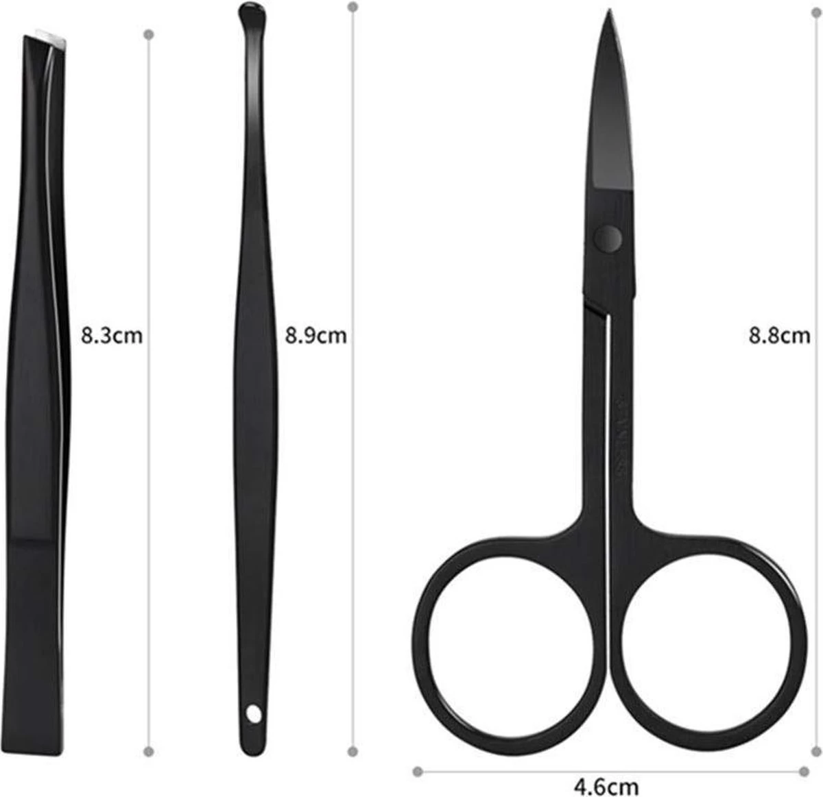 - Handverzorging (normale nagelknipper, schuine nagelknipper, nagelschaar, nagelvijl); voetverzorging (normale nagelknipper, schuine nagelknipper, nagelschaar, nagelvijl); gezichtsverzorging (wenkbrauwpincet, oorreiniger)