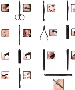 De complete set bestaat uit 15 verschillende tools waaronder een kleine- en grote nagelknipper, pincet, trimmer, schaar, vijl en reinigingsmesjes. Naast een complete nagelverzorging is de set ook te gebruiken bij het epileren van kleine haartjes, het afwerken van de randjes bij een baard en andere handelingen voor de algehele verzorging. Ideaal voor thuis, op reis en in elke professionele omgeving!
