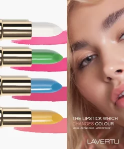 De lipstick geeft niet af, is waterproof en tevens rijk aan verzorgende bestanddelen zoals aloë vera, lanoline en bijenwas. De lipstick is verkrijgbaar in 4 persoonlijke tinten. De witte lipstick kleurt de lippen fris roze, groen wordt warm cyclaam, blauw stralend fuchsia en geel wordt zalmroze. U bepaalt dus zelf de kleurnuance die bij uw karakter en stemming past.