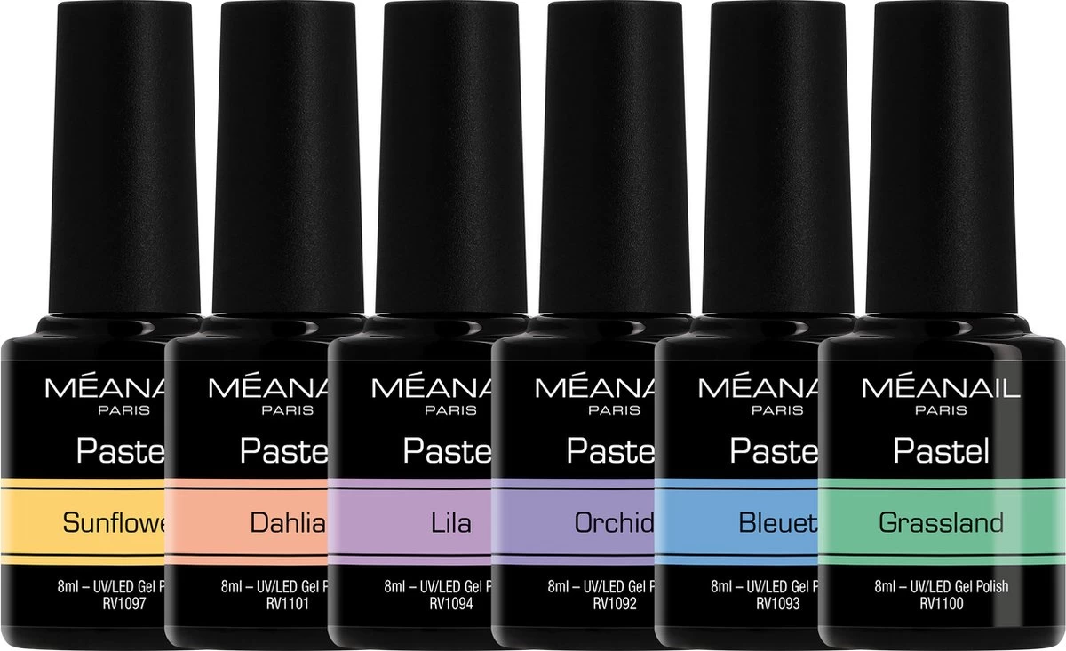 In deze mooie doos vind je 6 gellakjes van 8ml: Sunflower, Dahlia, Lila, Orchidée, Bleuet, Grassland.