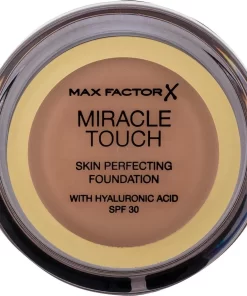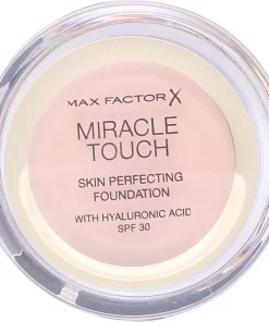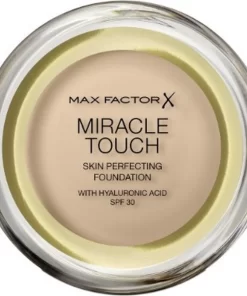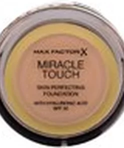 Max Factor Miracle Touch Foundation SPF30 is het iconische 3-in-1 product dat zorgt voor een frisse en egale huid, waar je ook bent. De geliefde compact-naar-vloeibare textuur is een concealer, foundation en poeder in één om de huid om direct een natuurlijke, onberispelijke finish te geven. De lichtgewicht, compacte formule veranderd door de warmte van de vingers in een vloeibare foundation en glijdt over de huid om grove poriën, oneffenheden en fijne lijntjes te camoufleren. Toevoeging van hyaluronzuur hydrateert en voedt de doffe huid en laat deze stralen. SPF30 helpt de huid te beschermen tegen schadelijke AVA,- en AVB stralingen en vermindert het risico op huidveroudering, veroorzaakt door zonschade. De Miracle Touch make up Foundation is eenvoudig aan te brengen en verspreidt moeiteloos over de huid voor een egale finish. De compacte verpakking maakt het eenvoudig om de foundation mee in je handtas te nemen, voor een snelle en praktische touch-up on the go. Gebruik de toegevoegde spons applicator om de dekking, daar waar nodig, naar wens op te bouwen.