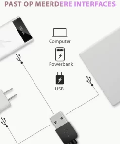 – Oplaadbaar en aansluiting via USB: Stekker, computer en powerbank