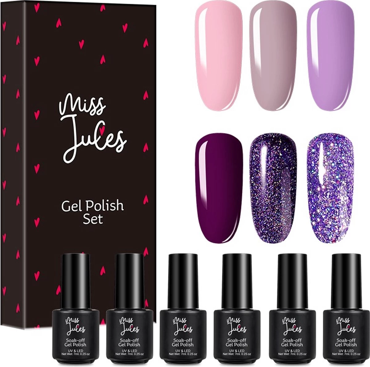 Miss Jules – 6-Delige Gellak Starterspakket – Nagellak – Kleur Paars, Lila & Glitter – Glanzend & Dekkend Resultaat