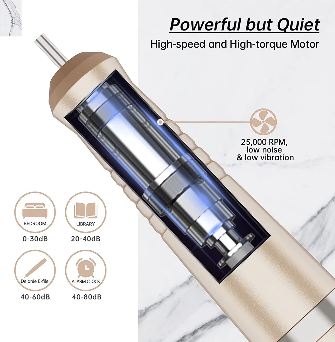- 25,000 rpm: The engine speed can be 25,000 rpm, suitable for nail modelling and gel nail polish of all thicknesses.