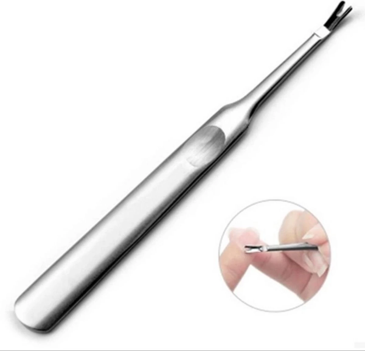 De metalen nagelriem remover wordt gebruikt voor nauwkeurig nagelriem trimmen en hybride polish verwijderen. Het heeft twee verschillende tips. De smallere, vlakkere tip verwijdert hybride lak van de nagelplaat, terwijl de andere ontworpen is om de nagelriemen naar binnen te duwen.