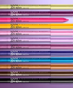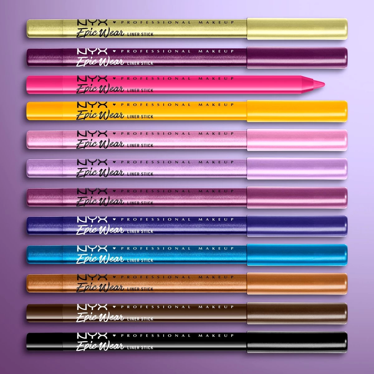 – De Epic Wear Liner Sticks is verkrijgbaar in Silver Lining, Gold Plated, All Time Olive, Gilded Taupe, Gunmetal Gaze, Berry Goth, Deepest Brown, Pitch Black, Pure White, Blue Trip, Turquoise Storm, Magenta Shock, Fierce Purple, Periwinkle Pop, Frosted Lila, Dusty Mauve, Cosmic Yellow, Orange Zest, Pink Spirit, Graphic Purple, Chill Blue, Intense Teal, Emerald Cut, Chartreuse