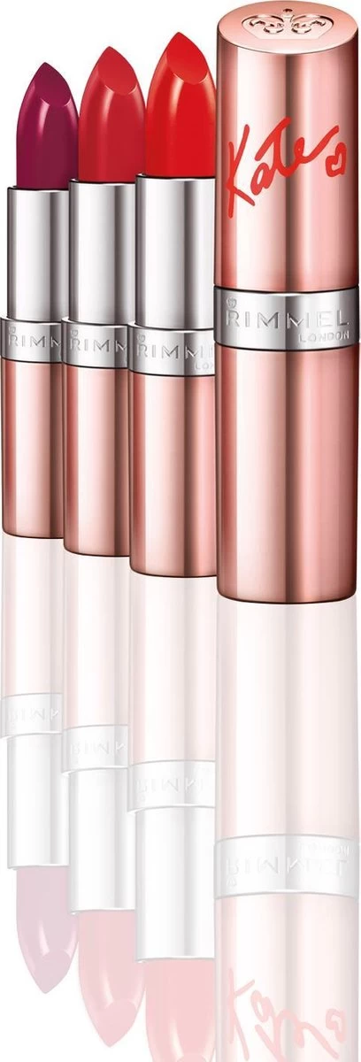 Rimmel en Kate’s samenwerking, was het debuut van Kate. Geliefd bij Rimmel girls over de hele wereld is deze lipstick een wereldwijd fenomeen. Voortbordurend op dit succes omvat de jubileumcollectie zes rijke kleuren – drie rode en drie nude tinten – elk geïnspireerd op een klassieke Kate Look.