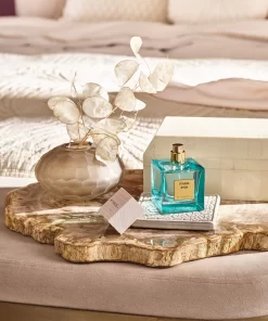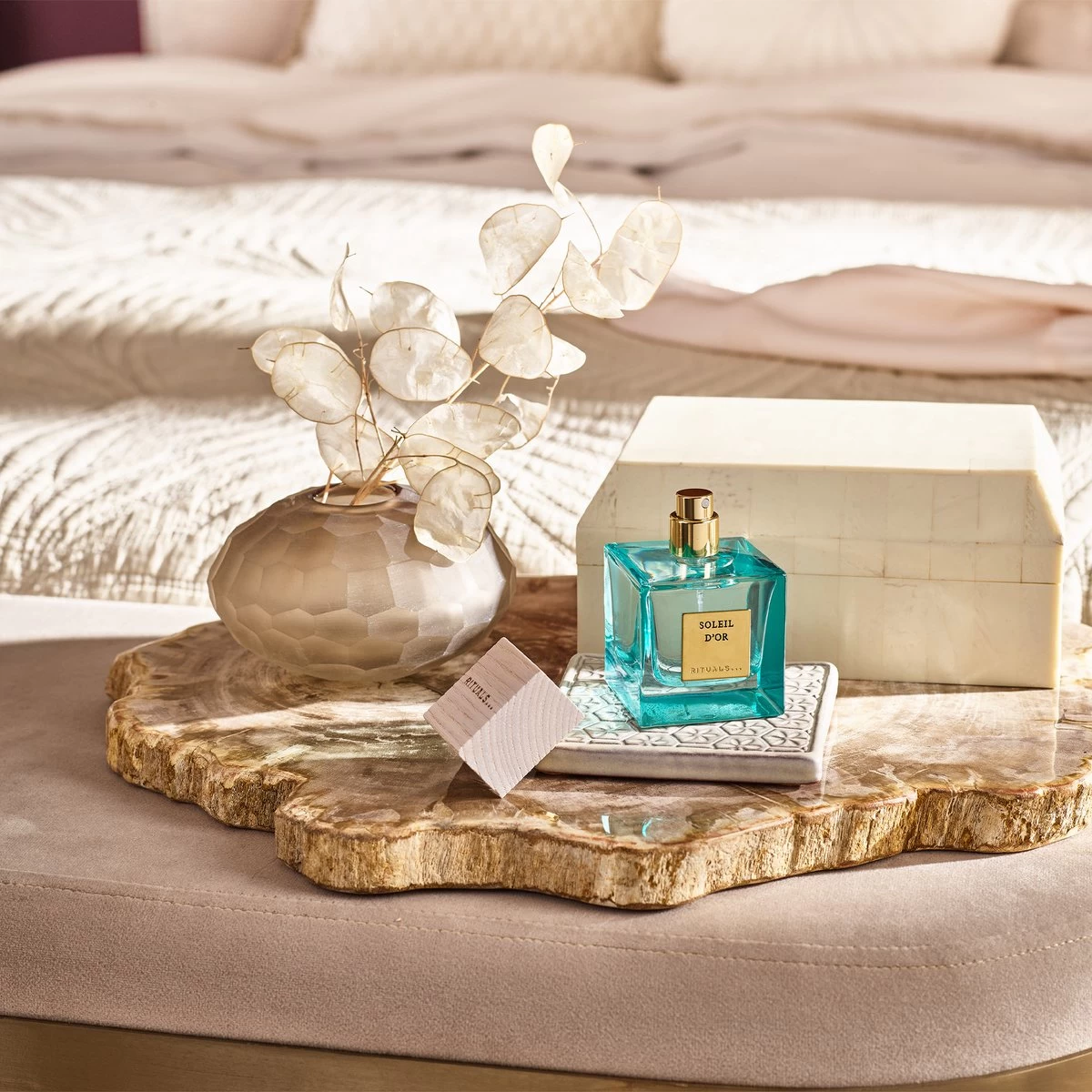 Deze levendige geur voert je mee naar de prachtige kust van India, waar de zon het gouden strand en de turquoise wateren verwarmt. Soleil d’Or straalt positieve energie en frisheid uit, met een begin van een helder en fris akkoord van peer, mandarijn en bergamot. Deze verfrissing wordt aangevuld met koele bloemennoten van fresia en lotusbloem, en een stralende, maar subtiele droge geur van cederhout en musk. Deze heerlijke geur behoort tot de Floral geurfamilie en bevat 80% ingrediënten van natuurlijke oorsprong. Al onze elegante parfumflacons zijn 100% recyclebaar, omdat je ze volledig kunt demonteren.