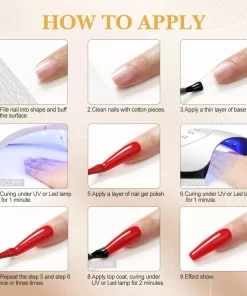 Start altijd met een basislaag (basecoat), vervolgens volgen er twee of 3 kleurlagen (indien je een kleurtje wenst) en als laatste een toplaag (topcoat) die het geheel beschermt. Tussen de verschillende lagen wordt de gel uitgehard onder een UV LED lamp.