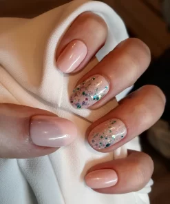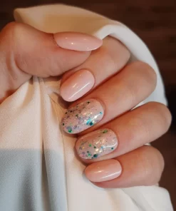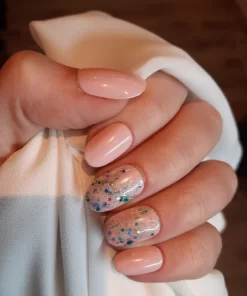 B-37 is een nuderoze setje van korte ronde nagels met blauwe glittertjes op de accentnagels.